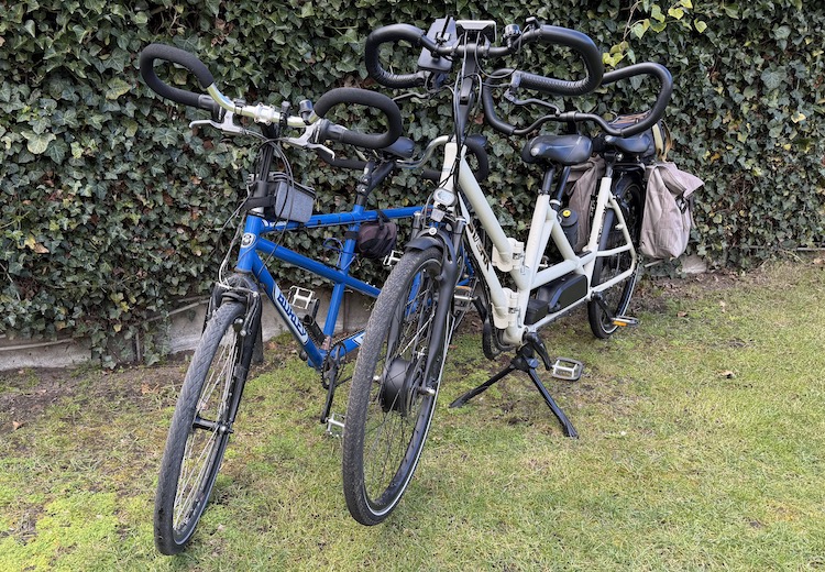 Onze voorzitter van vzw De Wommeltjes Chris Bonte bezit 2 tandems, een gewone en een elektrische. Wat is het gewicht in gram, van deze 2 tandems samen inclusief benodigheden (fietstas(sen), reserveband(en), fietsslot(en), fietsbel(len....)?